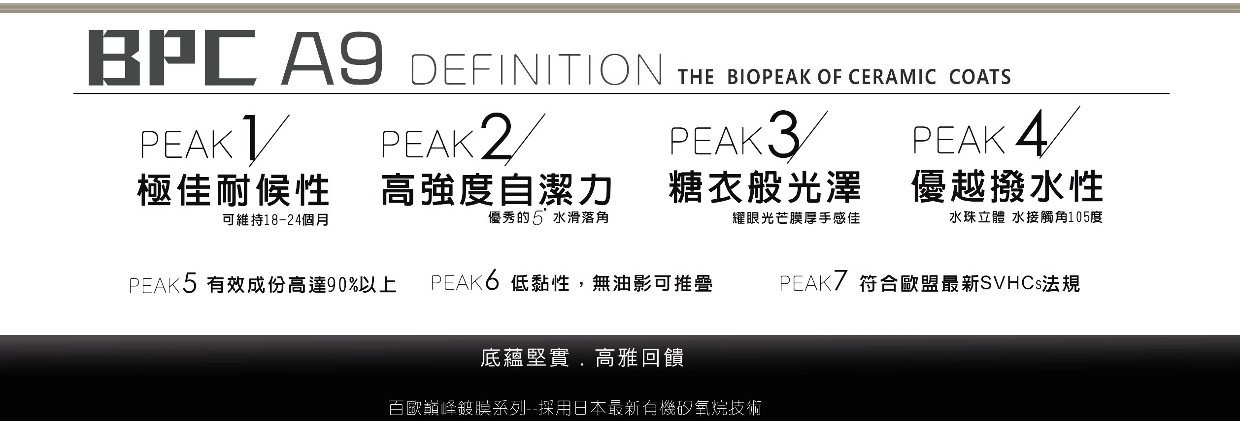 BPCA 日本最新2.0有機矽瓷鍍膜 卓越品質 職匠工法 採用日本最新高厲應性有機矽氧烷2.0 高度混合物採用高反應性有機矽瓷設計 可大幅提高SI-O-SI 矽氧烷鍵合物的性能 有效的增強鍍膜的耐候性及自潔性